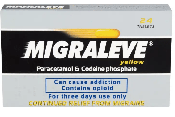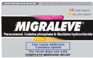 Yellow tablet = after tablet – paracetamol and codeine (no buclizine). For use when migraine symptoms persist after taking a pink tablet. Take yellow tablet at least 4 hours after a pink tablet. Further tablets can be taken in at least 4 hour intervals if symptoms still persist for up to 3 yellow doses.