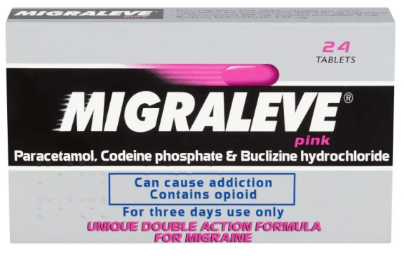 Pink tablet = main tablet – paracetamol, codeine and buclizine (sickness relief). Full treatment of migraine and can even stop an attack from developing if taken timely.