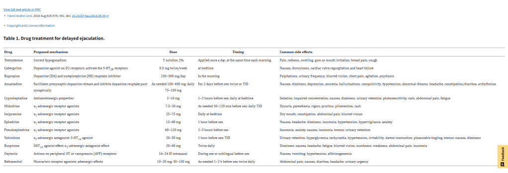 “For many pharmacological treatment options the evidence is still limited for small trials, case series or case reports. Further studies are warranted. Given the variety of drugs available for managing DE (Table 1), which one to choose might be a complicated issue in the clinical setting. The choice of management option should be guided by the etiologic factor, illness characteristics (DE or anejaculation), patient preferences, and physician’s comfort with different. For a patient who had suffered antidepressant-related DE, shifting to another antidepressant such as bupropion or adding cabergoline if there is hyperprolactinemia may be the prudent option. An individual with idiopathic DE, symptomatic management with one drug or a combination of drugs to target more than one therapeutic target may be an option of choice. Hence, the selection of drug would be best tailored to the needs of individual patient and the specific circumstances of the case. To conclude, successful drug treatment of DE is still in its infancy. The clinicians need to be aware of the pathogenesis of DE and the pharmacological basis underlying the use of different drugs to extend better care to the patients. Various drugs are available to address such problem, however the evidence of their efficacy is still limited and the choice of drugs needs to be individualized to each specific case.”